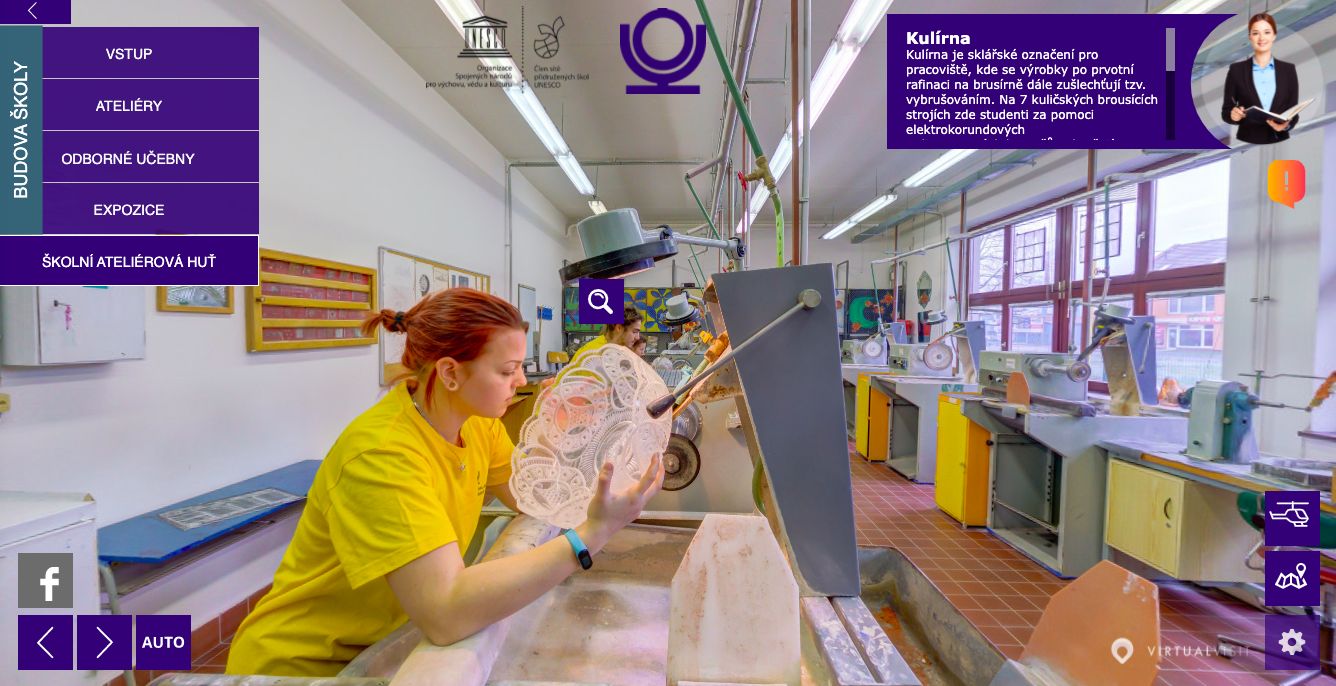 - Prohlídka začíná leteckým záběrem, který ukazuje prostředí školy.